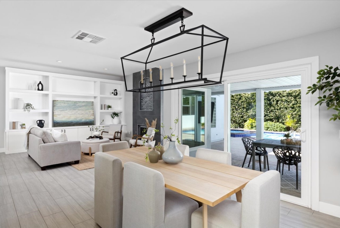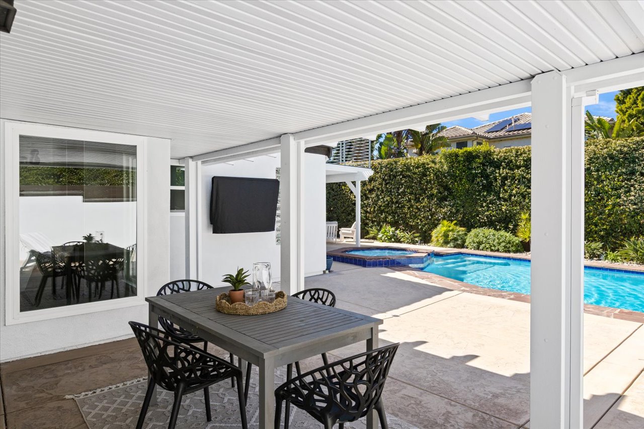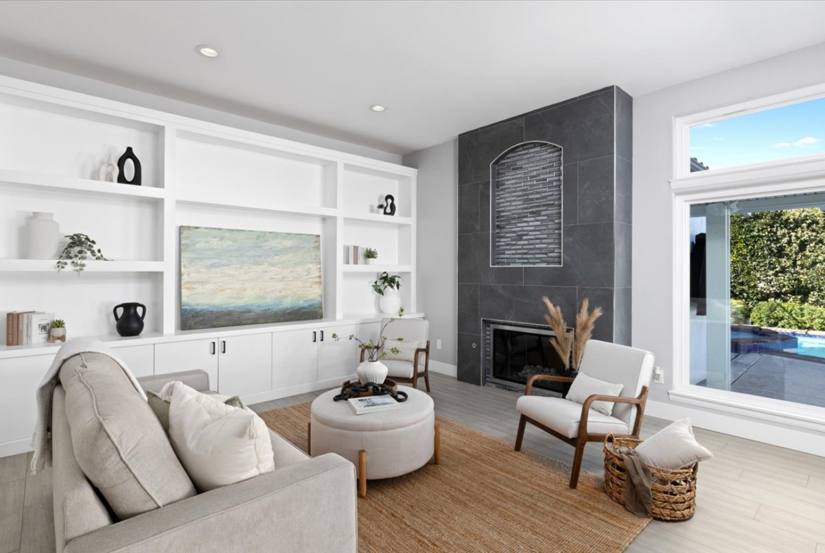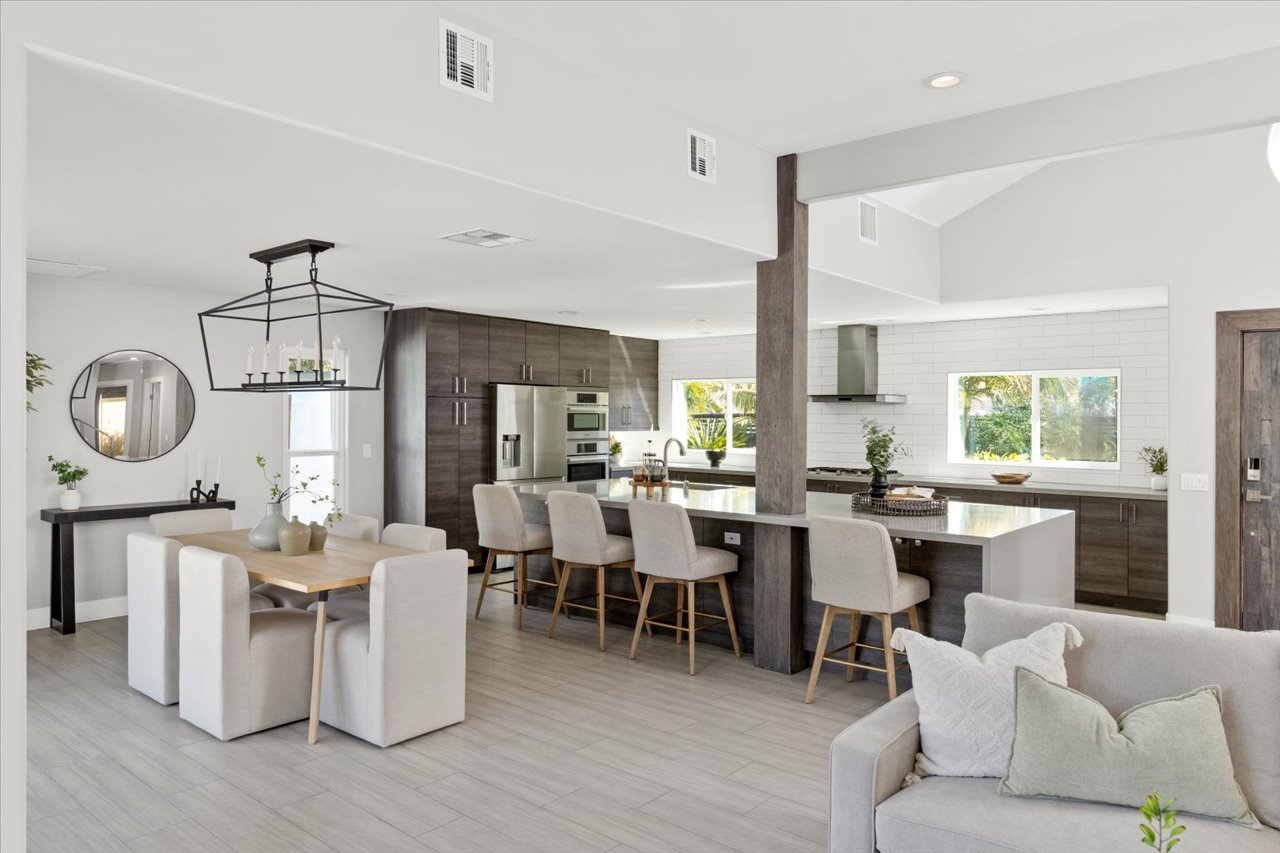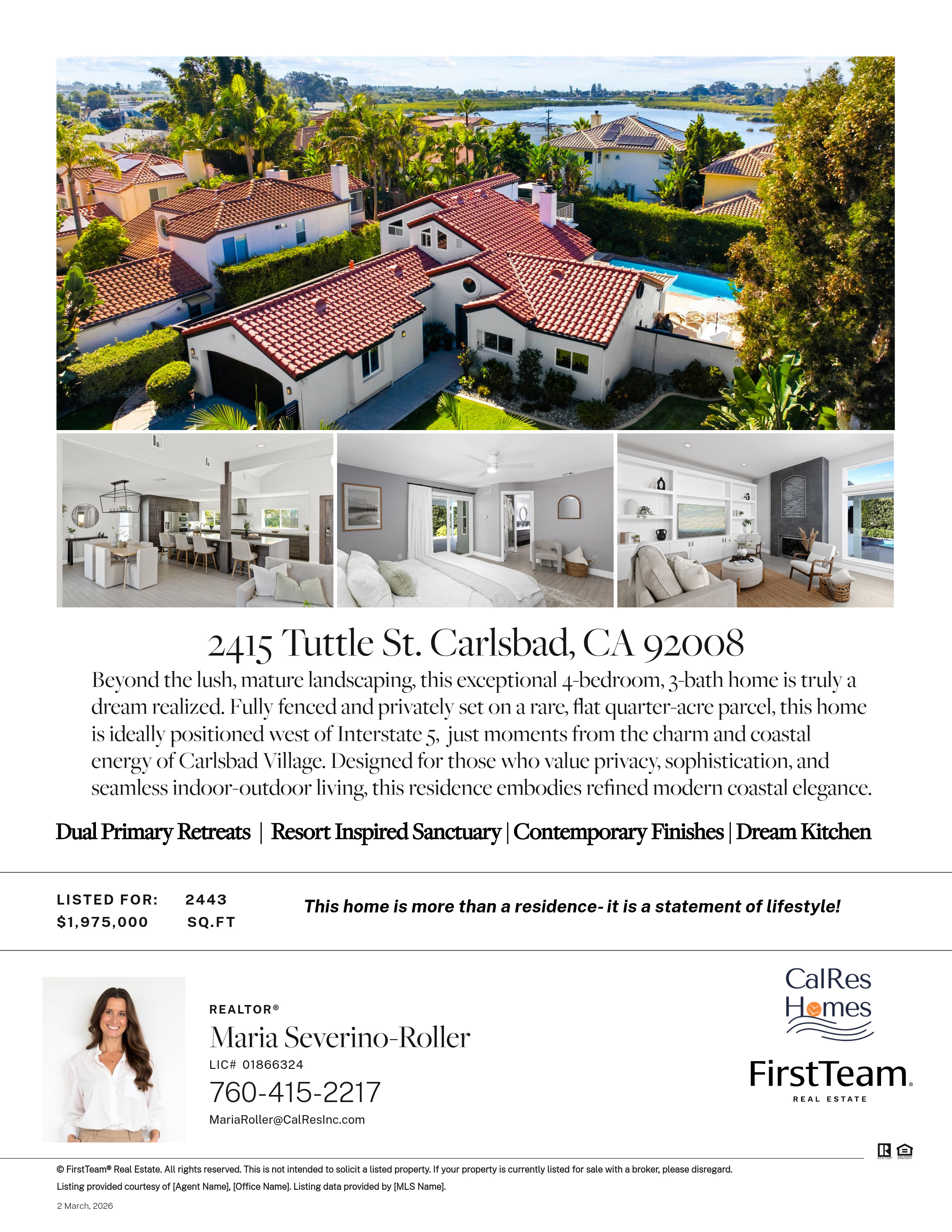 Situated on a rare, flat quarter-acre lot west of I-5, this fully fenced 4-bedroom, 3-bath residence offers refined coastal living just minutes from Carlsbad Village. Light-filled open living spaces feature soaring ceilings, floor-to-ceiling windows, custom built-ins, and a statement fireplace. The chef’s kitchen showcases premium appliances, modern cabinetry, subway tile backsplash, and an oversized quartz island ideal for entertaining.