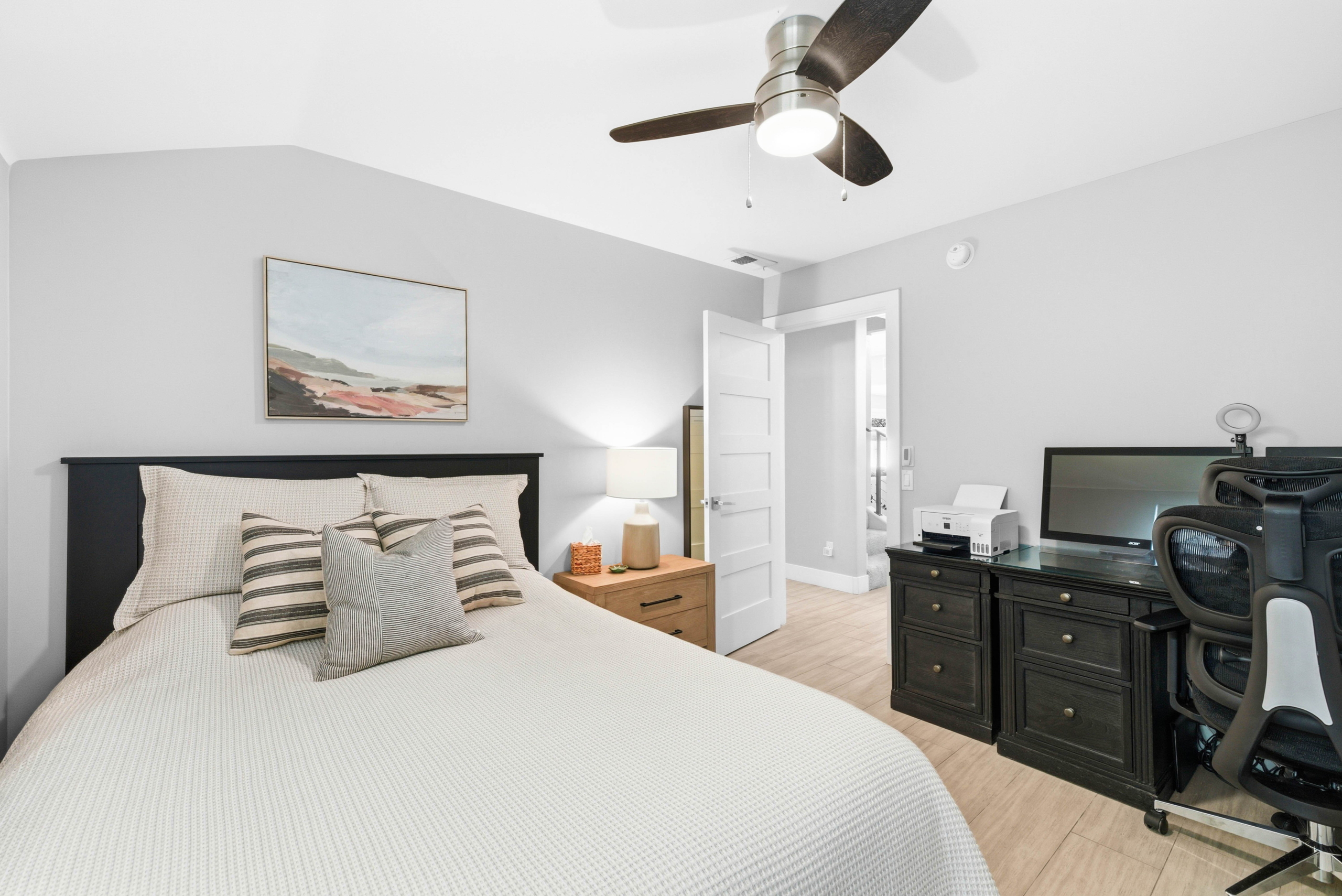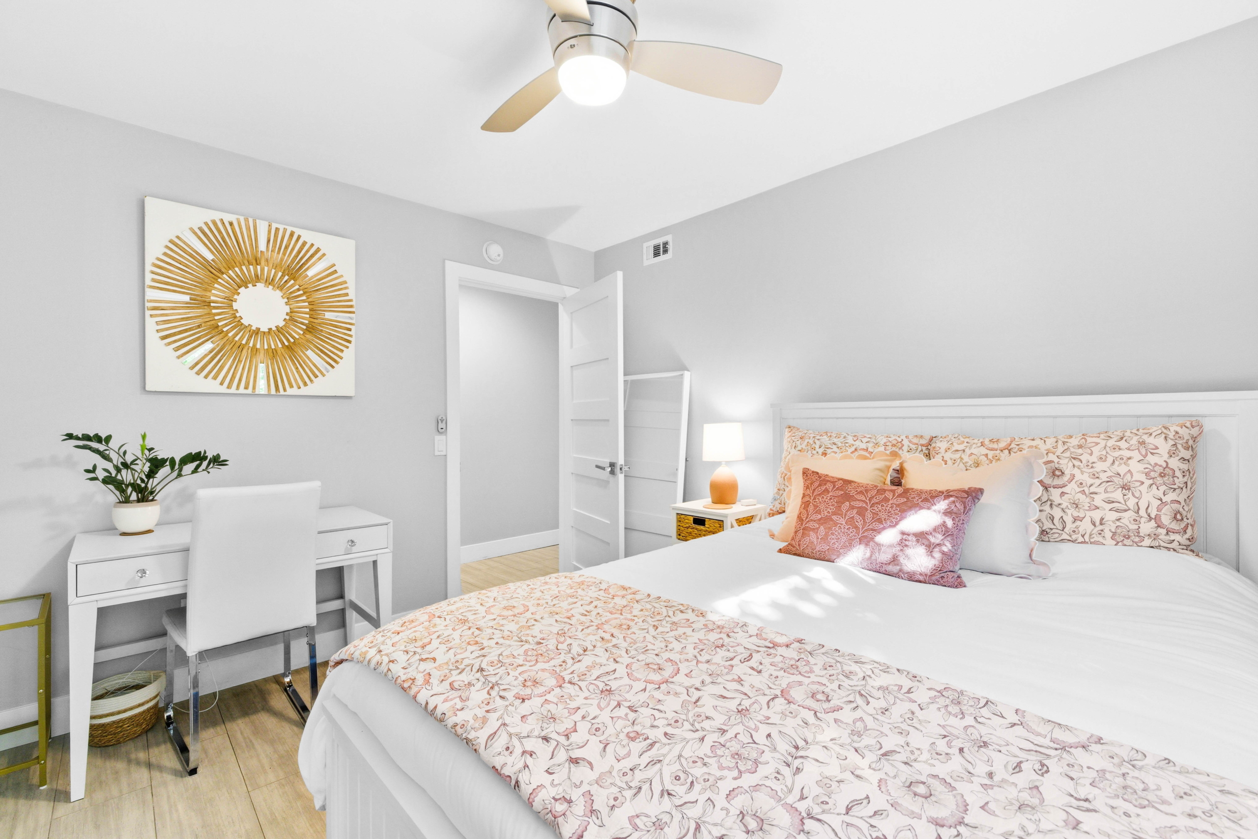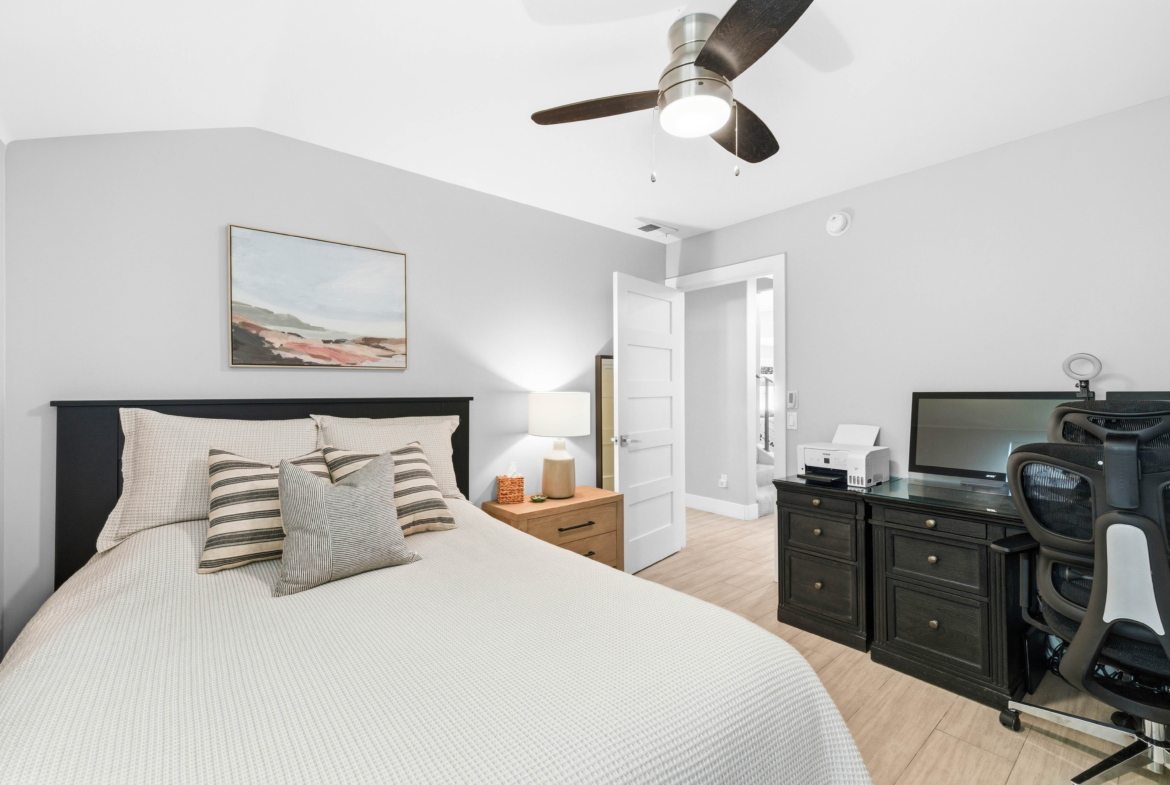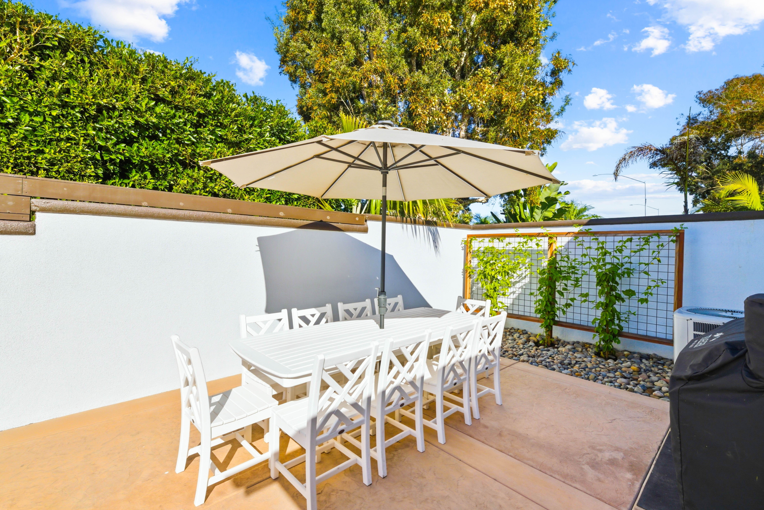 Situated on a rare, flat quarter-acre lot west of I-5, this fully fenced 4-bedroom, 3-bath residence offers refined coastal living just minutes from Carlsbad Village. Light-filled open living spaces feature soaring ceilings, floor-to-ceiling windows, custom built-ins, and a statement fireplace. The chef’s kitchen showcases premium appliances, modern cabinetry, subway tile backsplash, and an oversized quartz island ideal for entertaining.